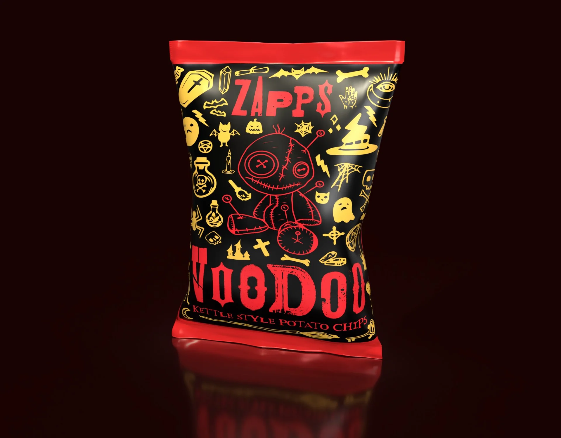 Zapps is a brand of kettle cooked potato chips that originated in New Orleans. They have all the flavors you expect, such as original, barbeque, and sour cream & onion. Beyond these, they have a few spooky adjacent flavors like Evil Eye and Voodoo. Voodoo are my favorite chips of all time, an accidental creation from when an employee mixed barbeque with salt & vinegar. I set out to redesign the packaging for these flavors as they are completely unique from Zapps usual lineup. This redesign leans into the spooky nature of the names and gives a bold look sure to stand out on shelves.